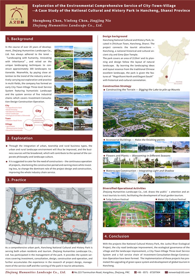 10月2日至4日,第十六屆中日韓風(fēng)景園林學(xué)術(shù)研討會在韓國首爾市召開。浙江人文園林股份有限公司派代表參加了本次會議,公司《“城-鎮(zhèn)-村”環(huán)境綜合服務(wù)實踐探索—以陜西省韓城市國家文史公園為例》一文被錄用,并在會議的壁報展示環(huán)節(jié)中進行了展示。