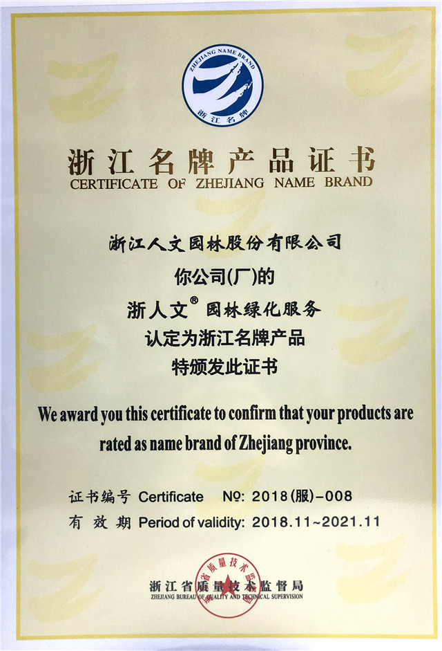 人文造園,質量為本,服務為先。繼2017年被評為“杭州服務名牌”后,2018年,浙江人文園林股份有限公司的“園林綠化服務”進一步被認定為“浙江名牌產品”。